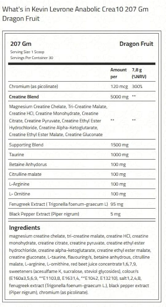 Kevin Levrone Anabolic Crea10 – 10-Type Creatine Blend (Dragon Fruit, 207g) | Muscle Growth, Strength & Recovery Booster
