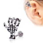 Unleash your inner horror fan with this fearsome zombie claw labret that brings spine-chilling style to your piercings! This unique piece features a detailed zombie claw design that appears to be clinging to your ear or lip, creating a dramatic and eye-catching effect that’s perfect for Halloween, horror enthusiasts, or anyone who loves edgy alternative fashion. The intricate design showcases bony joints and skeletal fingers with black antiquing accents that highlight every creepy detail. Crafted from premium 316L surgical stainless steel and polished to a brilliant mirror finish, this labret is hypoallergenic, durable, and safe for long-term wear. The externally threaded shaft with flat back ensures secure, comfortable wear while making insertion easy. Measuring 16 gauge (1.2mm) thickness with a 1/4 inch (6mm) length, this versatile piece works perfectly for cartilage, ear, lip, and labret piercings. Perfect for Halloween costumes, horror movie fans, gothic style, or making a bold statement year-round!
