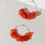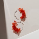 Sustainable 14k gold filled hoops with coral petals. Also available in sterling silver. Handmade with recycled metals and upcycled bottles in Arlington, VA. Light weight and fun. Dimensions are 1×1.25 inches.