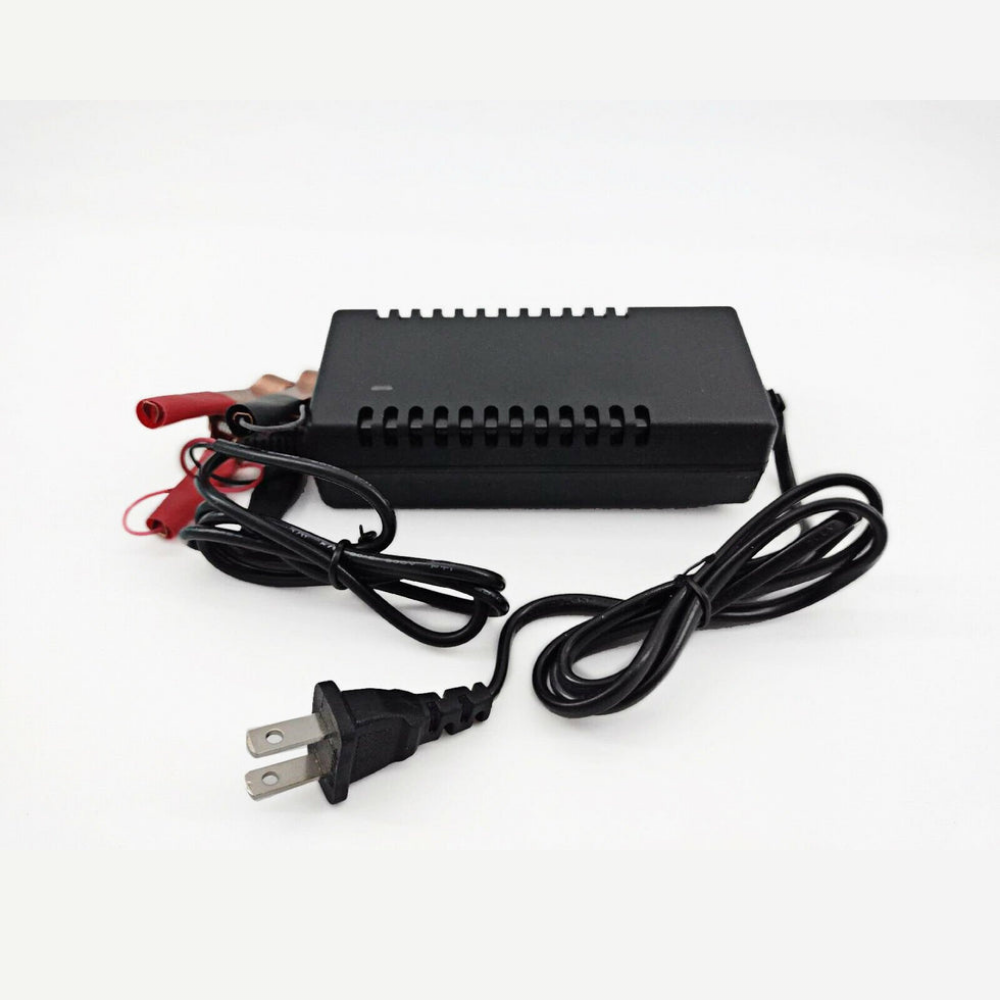 With an input voltage range of 110–240V and an output current of 1.5A–2.0A, it ensures efficient charging while preventing overcharge or overheating. The charger automatically switches to maintenance mode when fully charged, extending battery life. Indicator lights clearly show charging status – red for charging and green for full charge.
