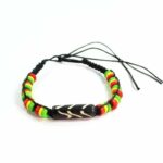 A tribal style friendship bracelet with a beautiful, glossy chevron pattern centerpiece in bone. Colorful beads in festive Rasta style red, yellow and green accent, all perfectly strung & handwoven along a sturdy and adjustable cotton cord.