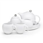 Full tea service in glossy white porcelain with silver plated ring knobs.