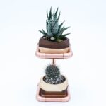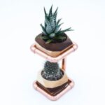 Display functional art in your home. This Modern and Minimalist planter offers an aesthetically clean way to bring life into your home. This planter holds two geometric planters. Each planter stand is handcrafted from waterproofed polished copper and geometric planters built from Maple and Walnut finished with several coats of oil.
