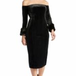Joia Dress – Velvet off the shoulder long sleeve dress with faux fur
