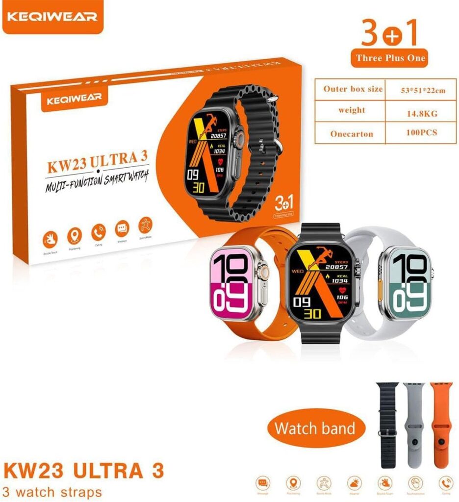 Stay connected and stylish with the KW23 Ultra 3+1 Smartwatch Set. This premium combo includes 4 interchangeable straps (3 standard + 1 bonus) to match your look for any occasion. The KW23 Ultra features a high-definition full-touch display, Bluetooth calling, and real-time health monitoring including heart rate, sleep tracking, and fitness modes. With its long-lasting battery life, IP67 waterproof rating, and multiple sport modes, this smartwatch is perfect for daily use, workouts, and outdoor activities. Designed for both performance and fashion, the KW23 Ultra 3+1 is your ultimate all-in-one smart companion.