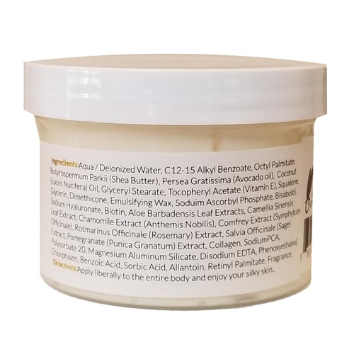 Relieve your skin from dryness with our Collagen Ultra Rich Body Cream. Our natural formula helps to moisturize intensely, leaving skin nourished and protected from the elements. Enriched with softening avocado oil, coconut oil, Shea butter, glycerin and moisturizing extracts (rosemary, sage, comfrey)it absorbs quickly to help soften and comfort the skin without leaving a greasy film. The infusion of vitamin E, Biotin and collagen helps promote elasticity and suppleness of the skin.