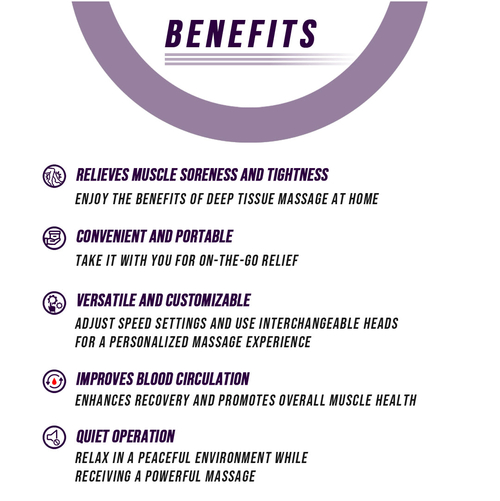 - Deep tissue massage: delivers powerful percussive therapy that targets sore and stiff muscles, relieves pain, and improves blood circulation.