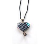 This necklace has a leather string 22 inches long and cotton woven pendant heart mounted on aluminum case.