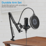 - Durable Arm Set:Studio Microphone with versatile and sturdy broadcast suspension boom scissor arm gives you great tools for capturing your voice in a podcast or voiceover.The Double Pop Filter provides two layers of dissipation, removes the rush of air caused by vocal plosives,minimizing the popp