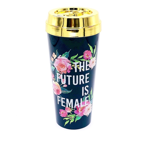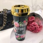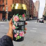 β’ This gold lid travel mug shows off your feminism while drinking your morning coffee or evening tea.