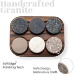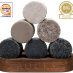 Discover fast-cooling non-diluting round solid granite stones used to perfectly cool fine spirits without watering down your drink. Each of our 6 whiskey stones has a different color and granite-style making each set unique and stand out beautifully. Elevate your drinking experience or spoil a loved one with our bestseller.