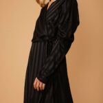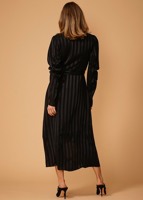 Stripe Satin Puffy Pleated Sleeves And Wrap Waist Lined Dress
